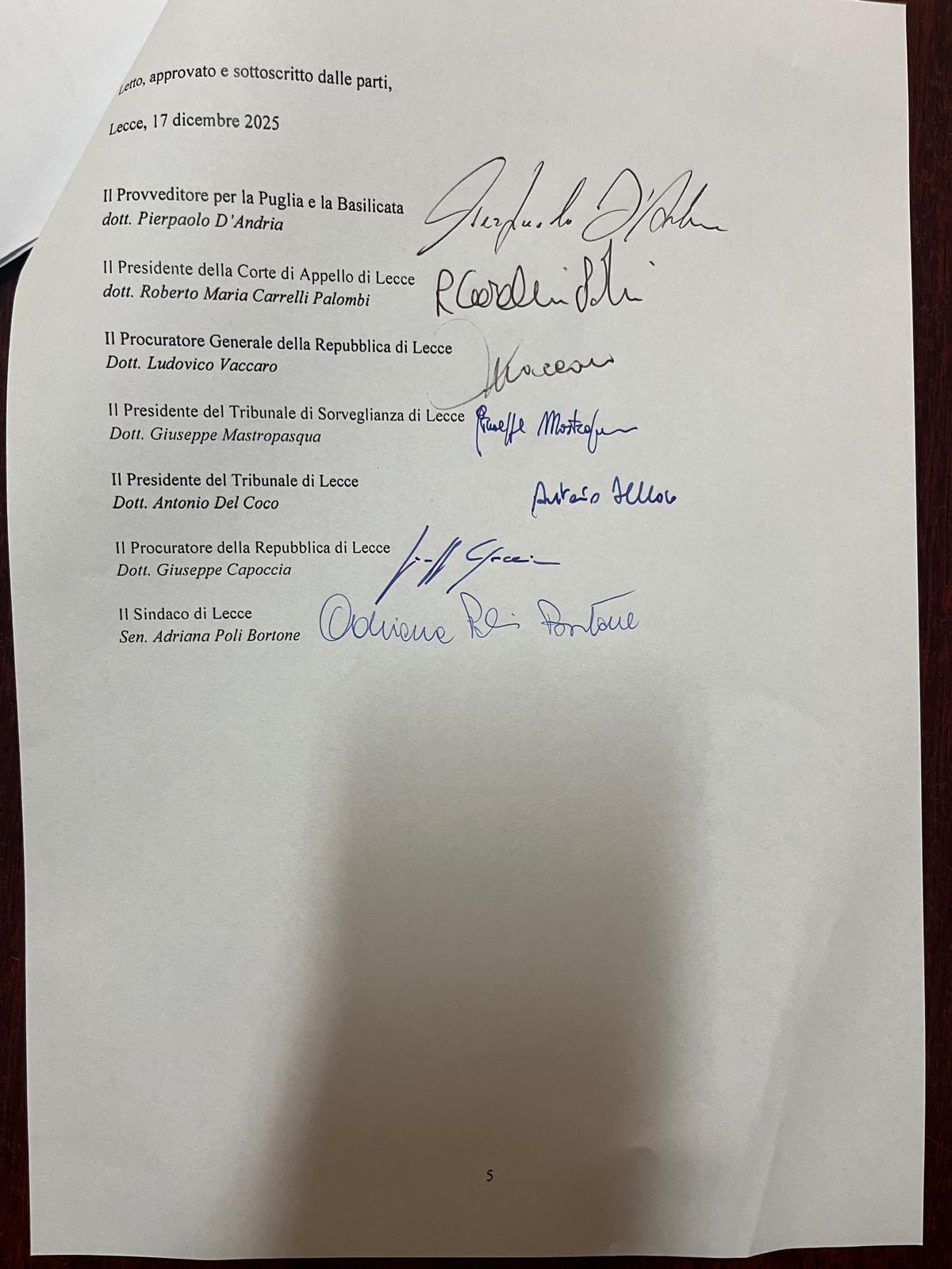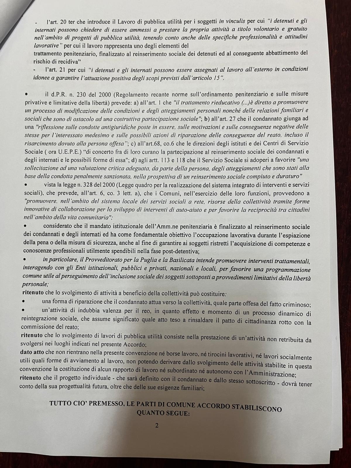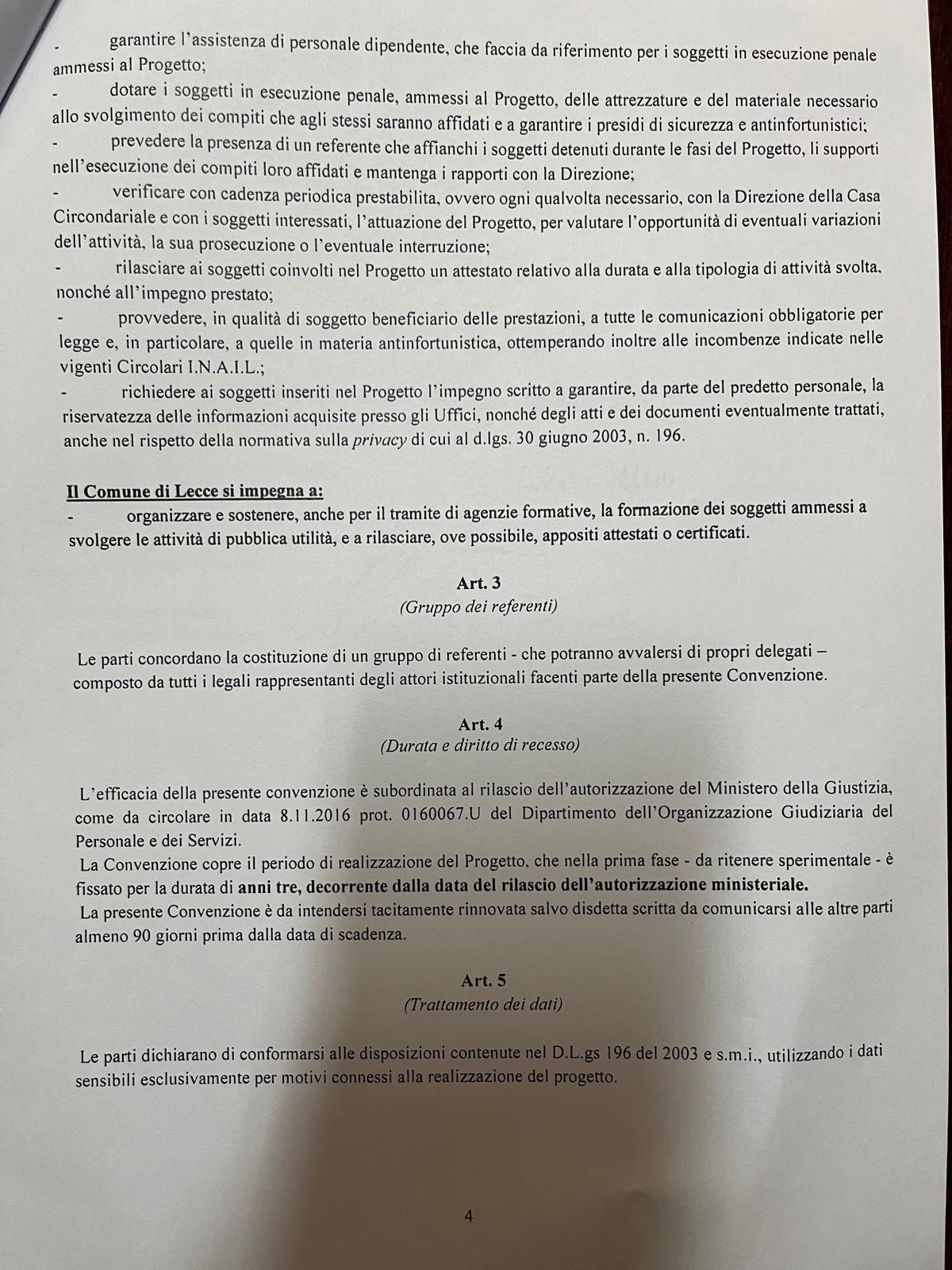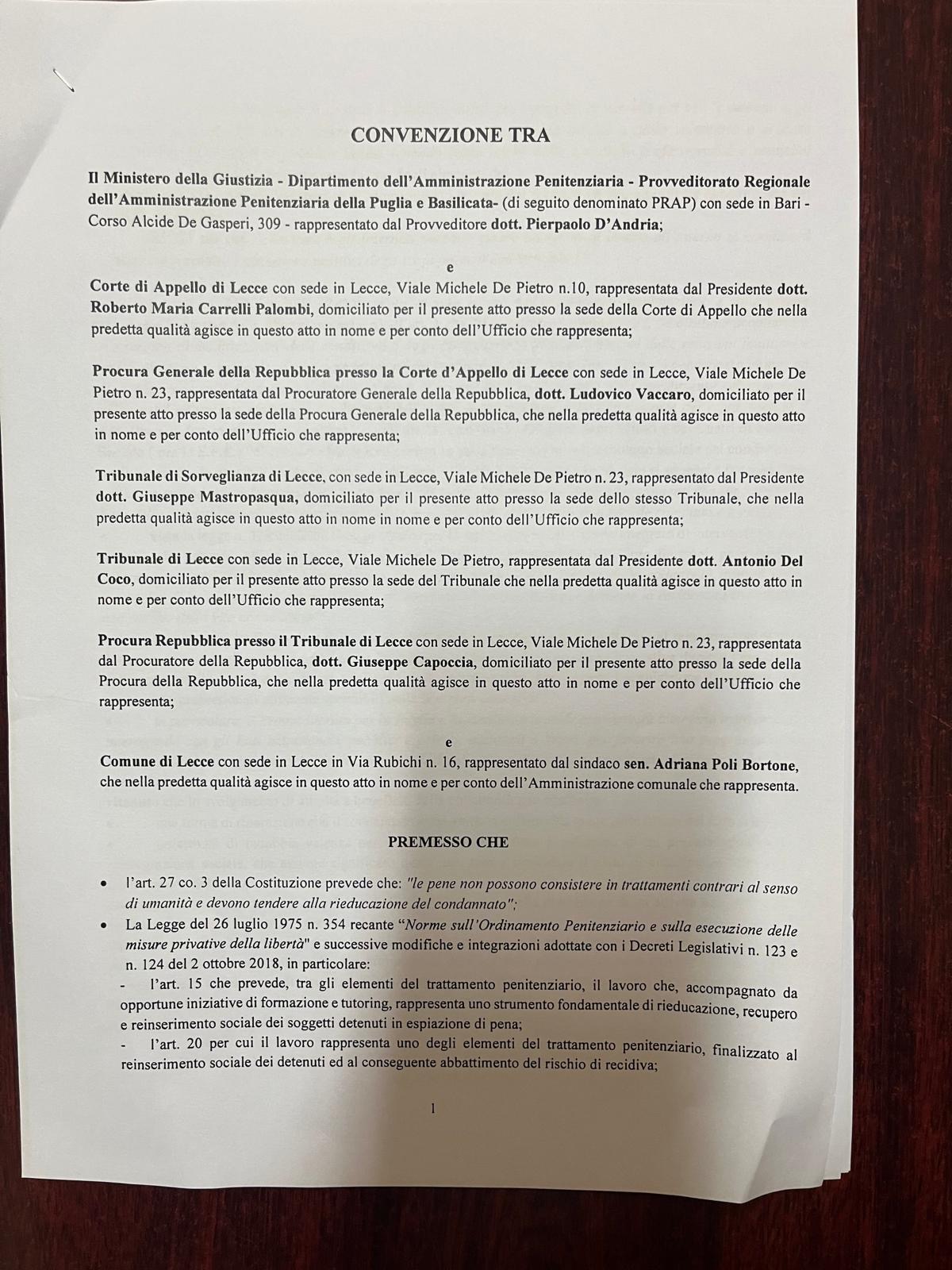 PRESA D’ATTO DELLA CONVENZIONE FINALIZZATA AL PROGETTO “RIORDINO ARCHIVI E MOVIMENTAZIONE FASCICOLI” SOTTOSCRITTO TRA IL MINISTERO DELLA GIUSTIZIA-DIPARTIMENTO DELL’AMMINISTRAZIONE PENITENZIARIA-PROVVEDITORATO REGIONALE DELL’AMMINISTRAZIONE PENITENZIARIA DELLA PUGLIA E BASILICATA, LA CORTE D’APPELLO DI LECCE, LA PROCURA GENERALE DELLA REPUBBLICA PRESSO LA CORTE D’APPELLO DI LECCE, IL TRIBUNALE DI SORVEGLIANZA DI LECCE, IL TRIBUNALE DI LECCE, LA PROCURA DELLA REPUBBLICA DI LECCE E IL COMUNE DI LECCE